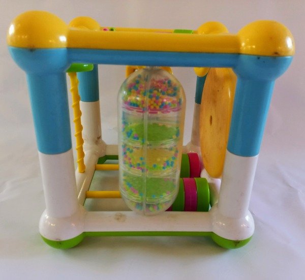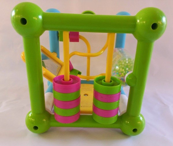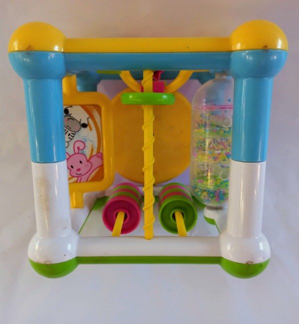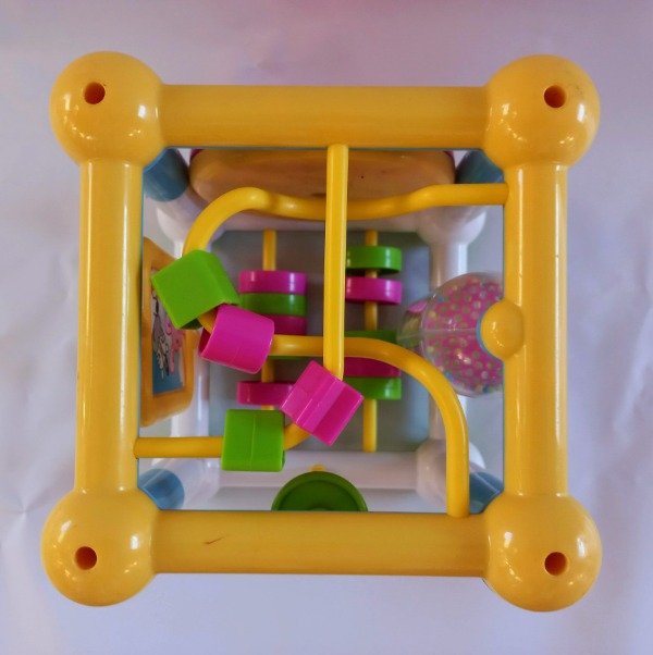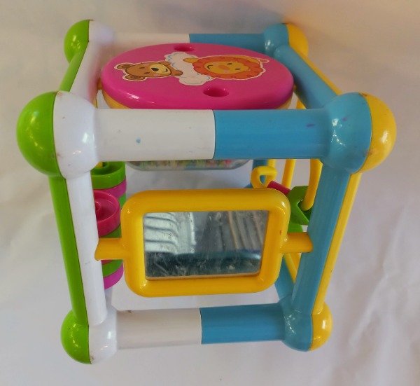 Cubo de actividades didácticas para bebes (laberintos, espejo, rueda con sonido, pasante de aros). Medidas 15 cm x 15 cm cada lado. USADO, excelente estado