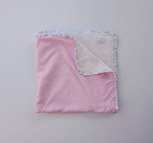 Manta recibidora doble, algodón en color rosado de un lado y polar blanco en el otro. Terminación con voladitos estampados. Medidas: 75 cm x 75 cm. USADO