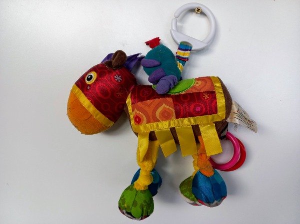 Sonajero colgante caballito con diferentes texturas didácticas. Medidas: ancho 22 cm, alto 22 cm. USADO, buen estado