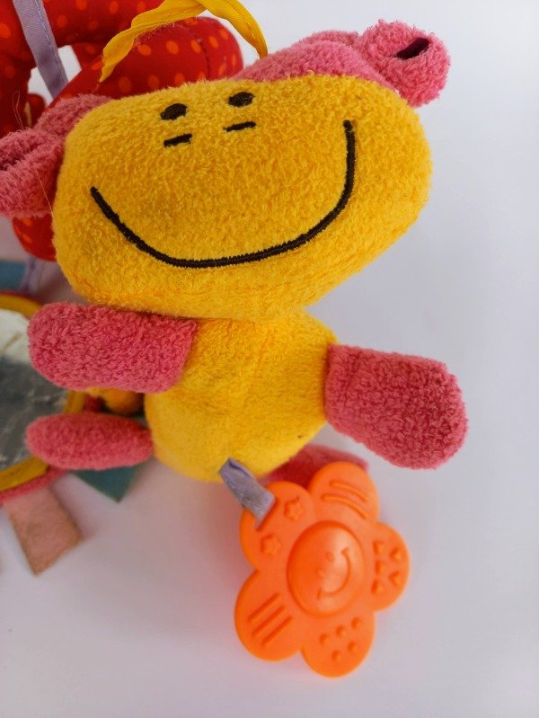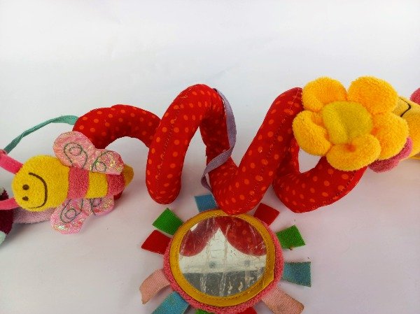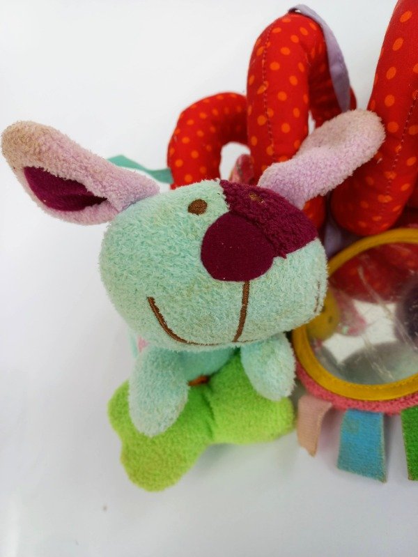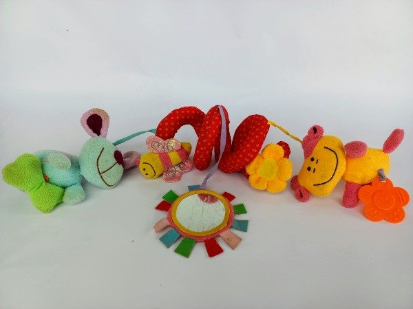 Tira de coche o cuna con colgantes peluches, sonajeros, mordillo y espejo. Largo total 30 cm. USADO, buen estado
