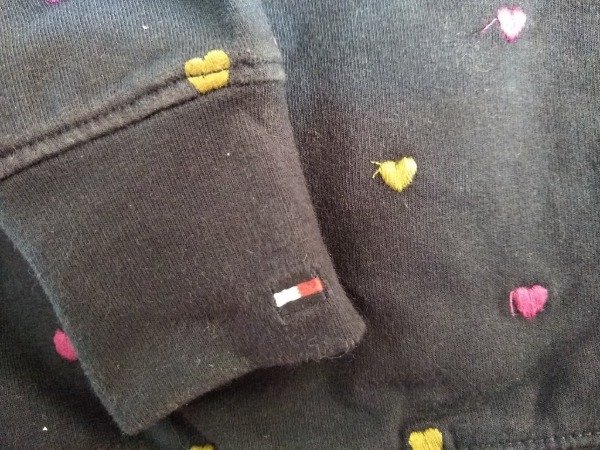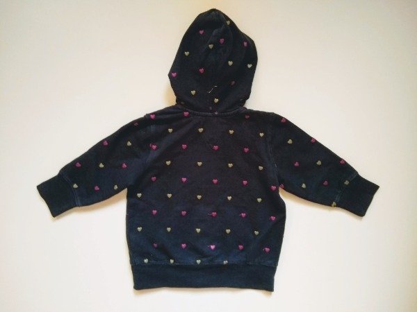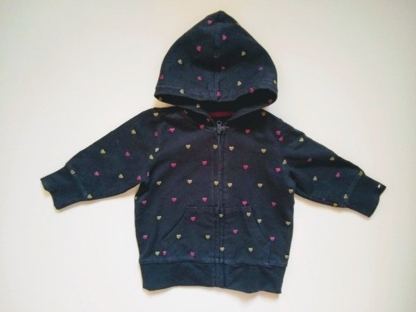 Campera de algodon con friza color azul marino bordado con corazones. Talle 6-9 meses. Medidas: ancho hombros 22 cm, largo de mangas 23 cm, largo total 33 cm. USADO, excelente estado
