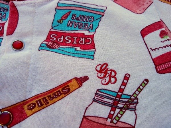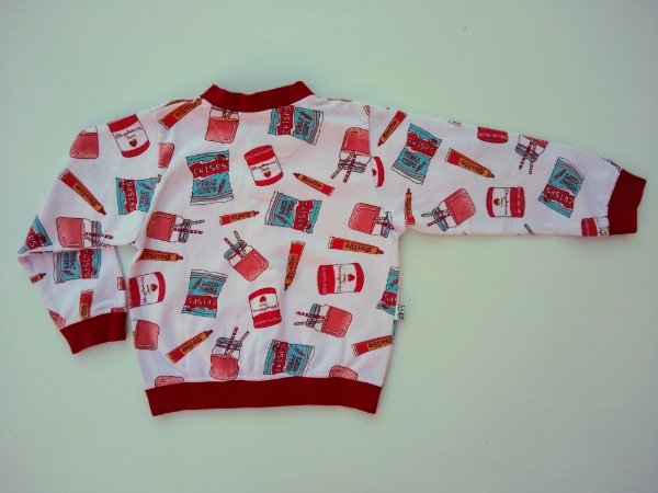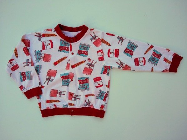 Campera de algodón rústico estampado. Prende con broches al tono. Medidas: ancho de hombro 28 cm, largo de manga 37 cm, largo total 39 cm. USADO, buen estado