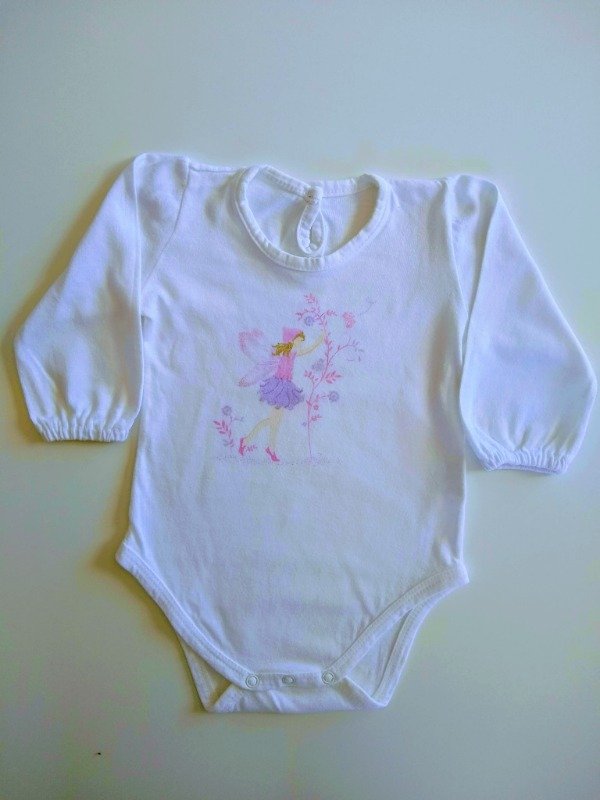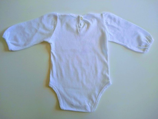 Body de algodón manga larga color blanco con estampa al frente. Talle M (6-9 meses), no tiene la etiqueta. Medidas: ancho de hombro 18 cm, largo de manga 23 cm, largo total 39 cm. USADO, buen estado