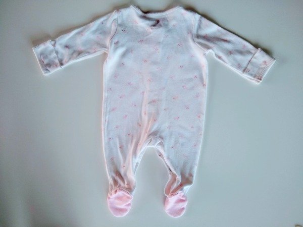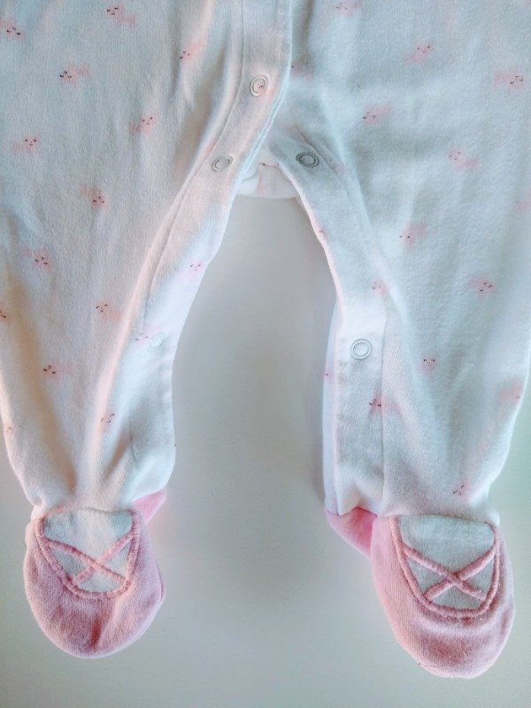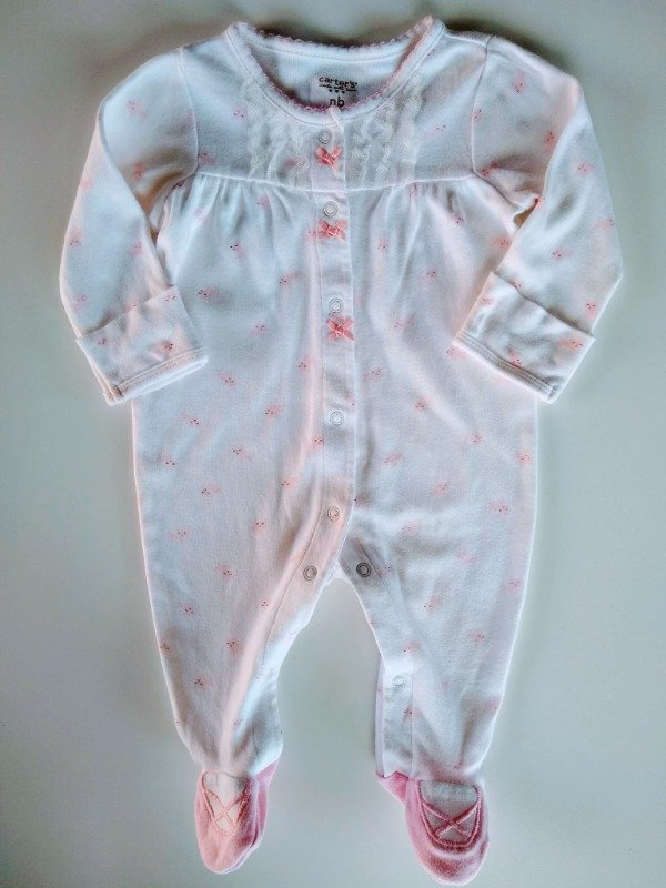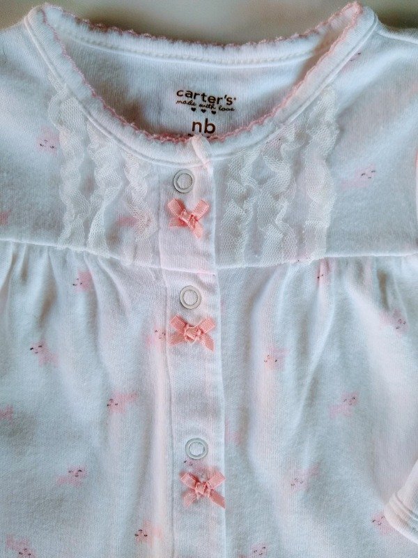 Osito de algodón con puntillas y moñitos en la pechera, puño en las mangas para cubrir las manos del bebe y el piecito es tipo zapato de bailarina. Tiene una pequeña manchita en la espalda que pasa desapercibida (por eso ese precio). Talle RN. Medidas: ancho de hombro 17 cm, largo de manga 21 cm, largo total 48 cm. USADO