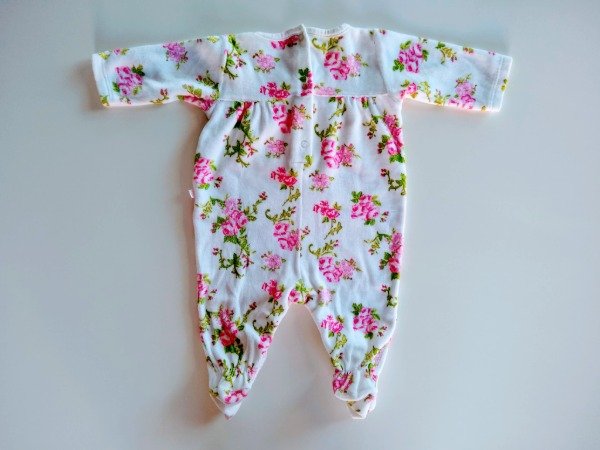 Enterito de plush estampado, prende con broches en la espalda y en la entrepierna. Talle XS (1-3 meses). Medidas: ancho de hombro 20 cm, largo de manga 18 cm, largo total 50 cm. COMO NUEVO