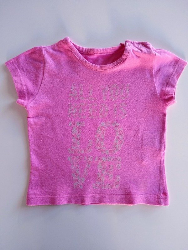 Remera manga corta de algodón con estampa al frente. Talle M (6-9 meses) Medidas: ancho de hombro 19 cm, largo total 30 cm. USADO, buen estado