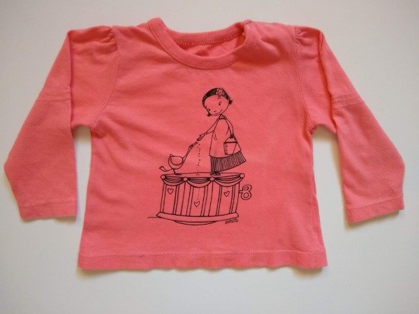 Remera de algodon manga larga con estampa. Prende con broches en el hombro. Medidas: ancho de hombro 21 cm, largo manga 25 cm, largo total 27,5 cm. USADO, muy buen estado