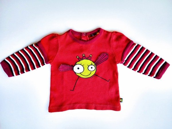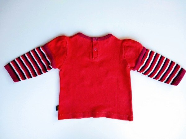 Remera de algodón grueso, con mangas combinadas y aplique al frente. Medidas: ancho de hombro 21 cm, largo de manga 25 cm, largo total 31 cm. USADO, muy buen estado