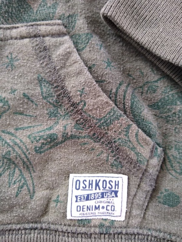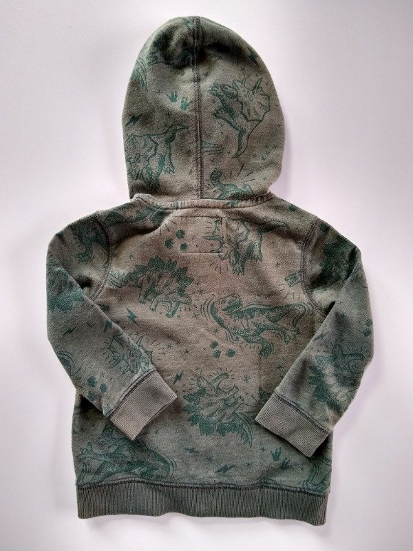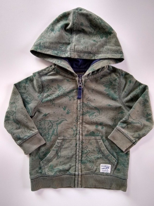 Campera de algodón verde musgo estampado, con capucha y bolsillos canguro. Talle 12-18 meses. Medidas: ancho de hombro 25,5 cm, largo manga 29 cm, largo total 37 cm. USADO