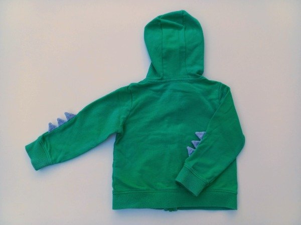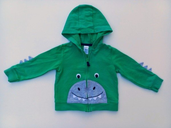 Campera de algodón rústico color verde con capucha y apliques dinosaurio. Medidas: ancho de hombro 23,5 cm, largo de manga 28 cm, largo total 32 cm. USADO, buen estado