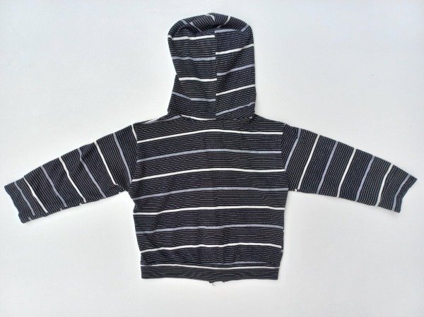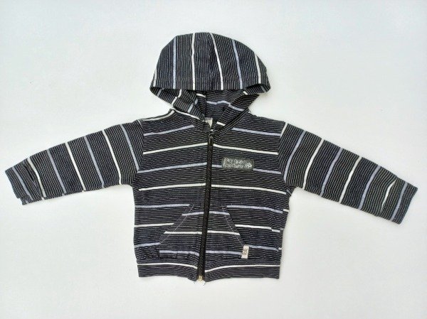 Campera de algodón fino rayado . Tiene capucha y bolsillos canguro. Talle 0. Medidas: ancho de hombro 26,5 cm, largo de manga 25 cm, largo total 30 cm. USADO, buen estado
