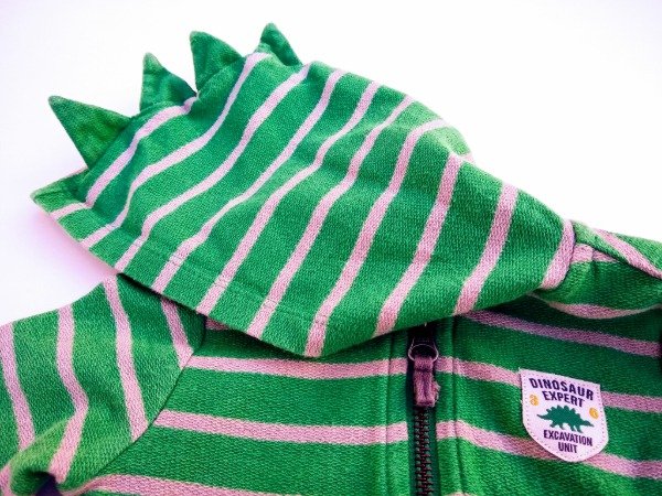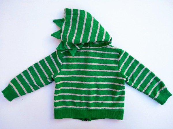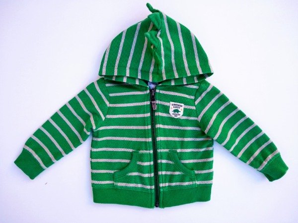 Campera de algodón rústico rayado. Tiene capucha dinosaurio y bolsillos canguro. Medidas: ancho de hombro 22,5 cm, largo de manga 27 cm, largo total 30,5 cm. USADO, buen estado