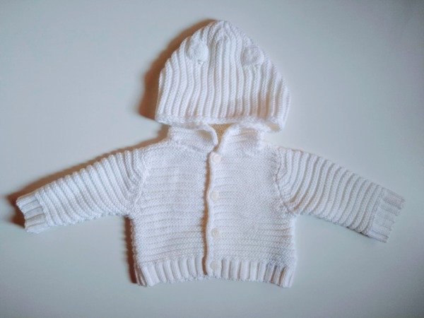 Saquito de lana con capucha con orejitas. Talle 1-3 meses. Medidas: ancho de hombro 23 cm, largo manga 24 cm, largo total 24 cm. USADO, muy buen estado