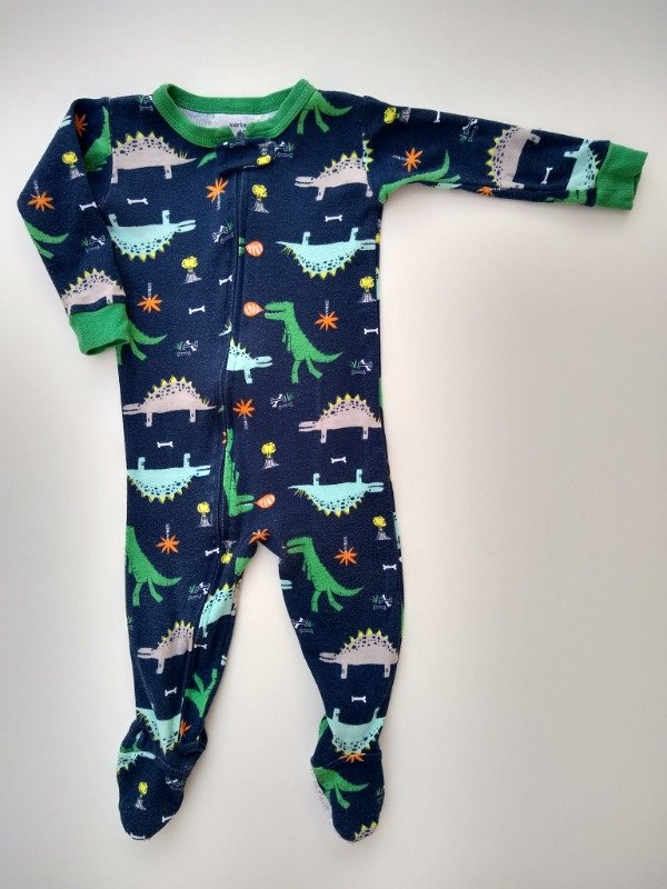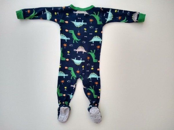 Enterito de algodón color azul con estampado dinosaurios. Posee cierre en toda su extensión. La base del pie es antideslizante. Medidas: ancho de hombro 23 cm, largo de manga 24,5 cm, largo total 62 cm. USADO