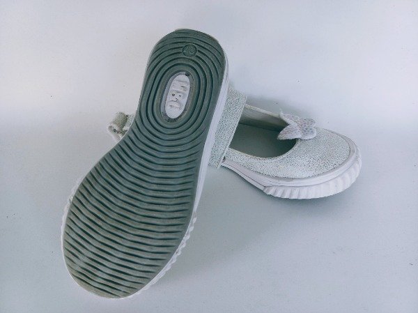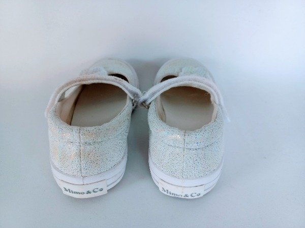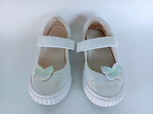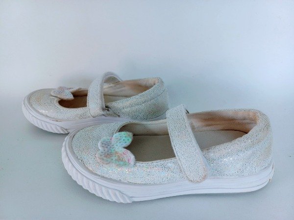Guillerminas de lona color blanco con brillos y aplique mariposa con lentejuelas. Plantilla interna 17 cm. COMO NUEVO