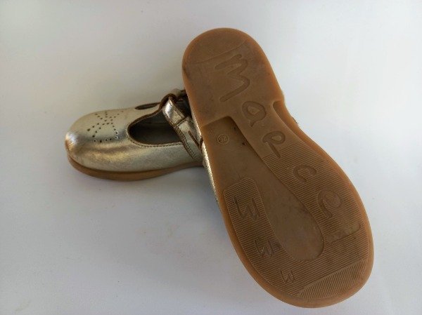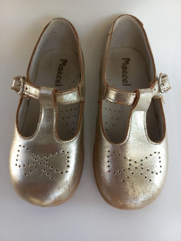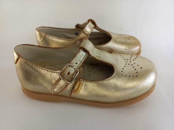 Guillermina de cuero calada en color dorado. Plantilla interna 17 cm. USADO, buen estado