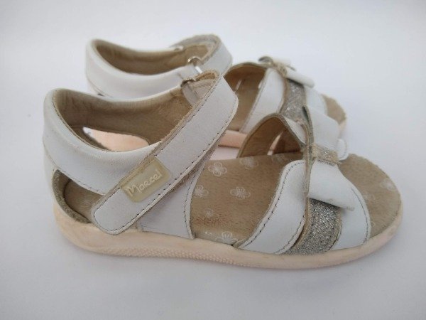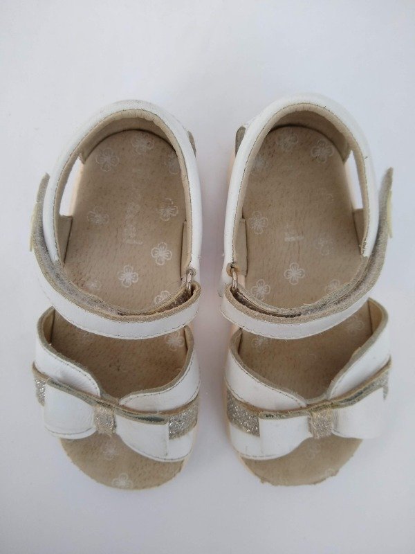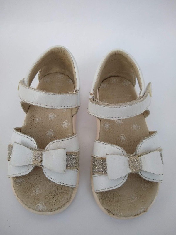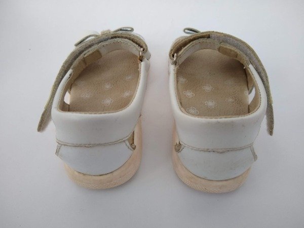 Sandalia de cuero en color blanco con aplique de moño. Plantilla interna 15,5 cm. USADO, buen estado