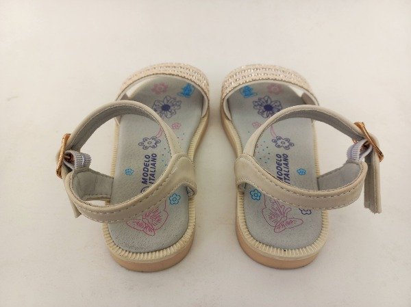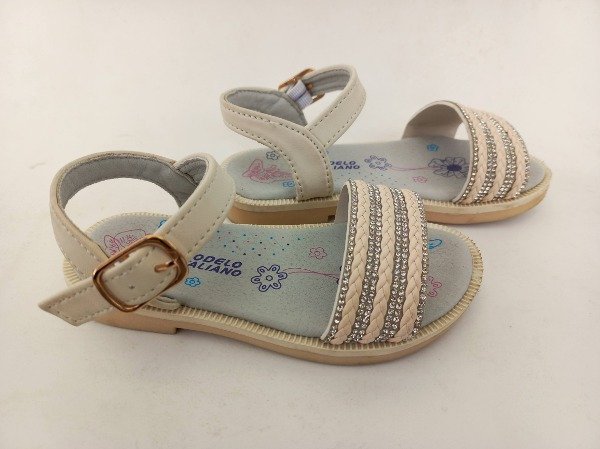 Sandalias de cuero sintético en color marfil con brillo en la capellada. Plantilla interna 16 cm. COMO NUEVO