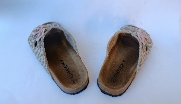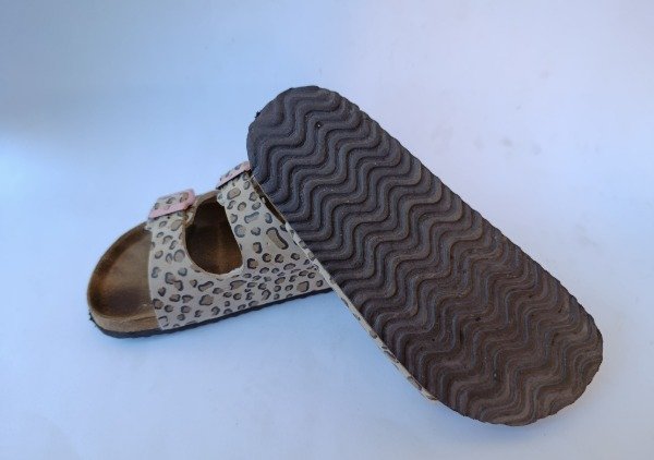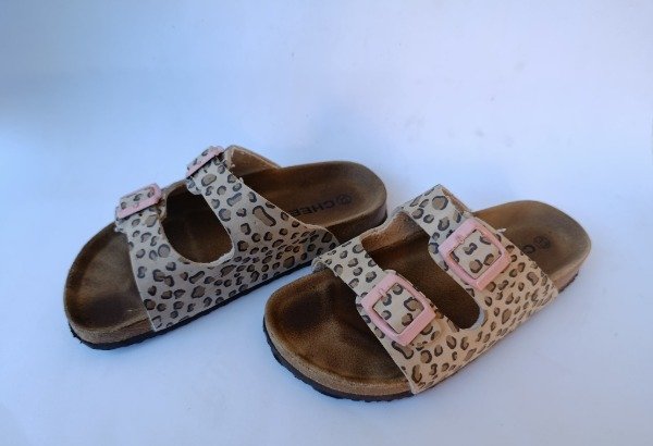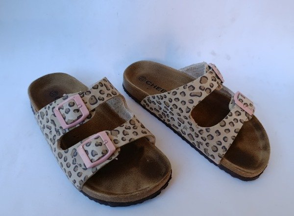 Sandalias con hebillas en cuero sintetico animal print. Suela de goma eva y caucho. Plantilla interna 19,5 cm. USADO, buen estado