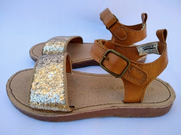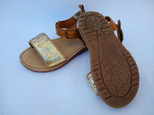 Sandalias de cuero color suela con glitter en la capellada. Se ajusta el calce con velcro. Plantilla interna 18,5 cm. USADO.