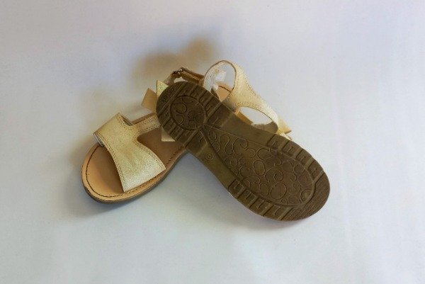 Sandalias de cuero sintético color marfil con brillo. Prende con abrojo en la pulsera y tiene detalle de moño al frente. Plantilla interna 18,5 cm. COMO NUEVO