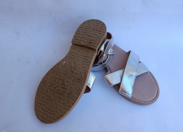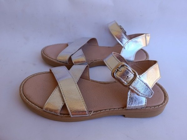 Sandalias de cuero sintetico con tiras en color plateado. Plantilla interna 21 cm. COMO NUEVO