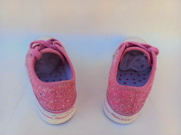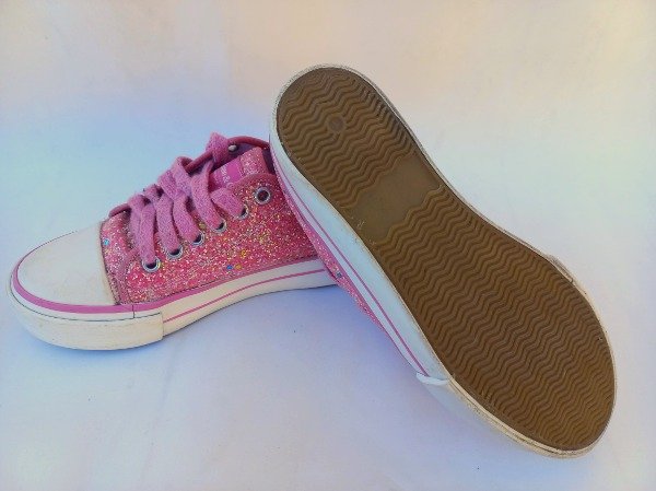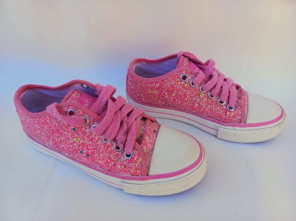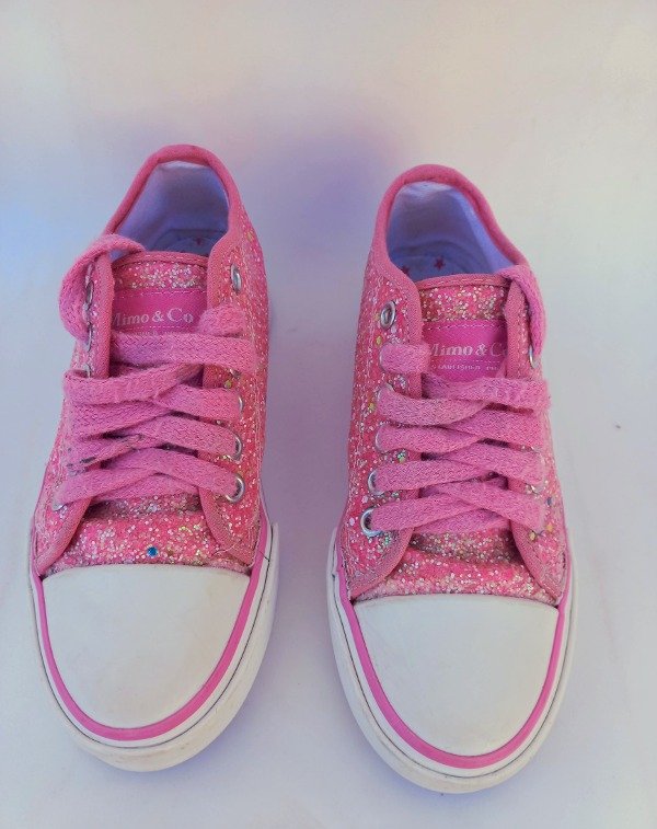 Zapatillas acordonadas de lona con glitter en color rosa. Plantilla interna 20 cm. COMO NUEVO