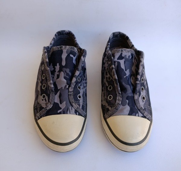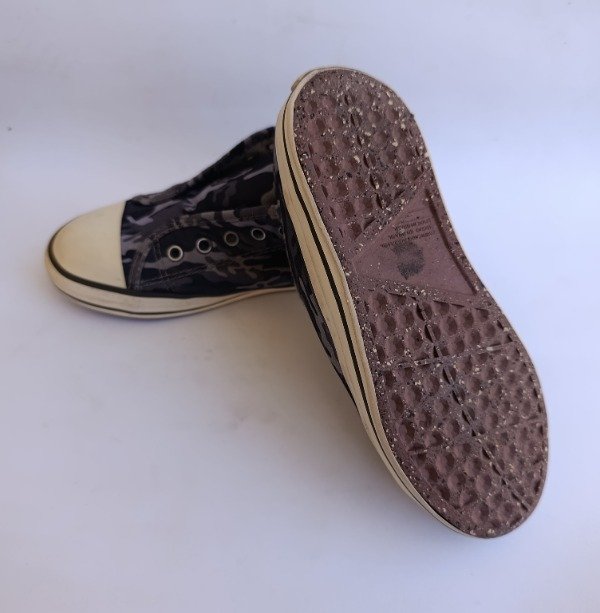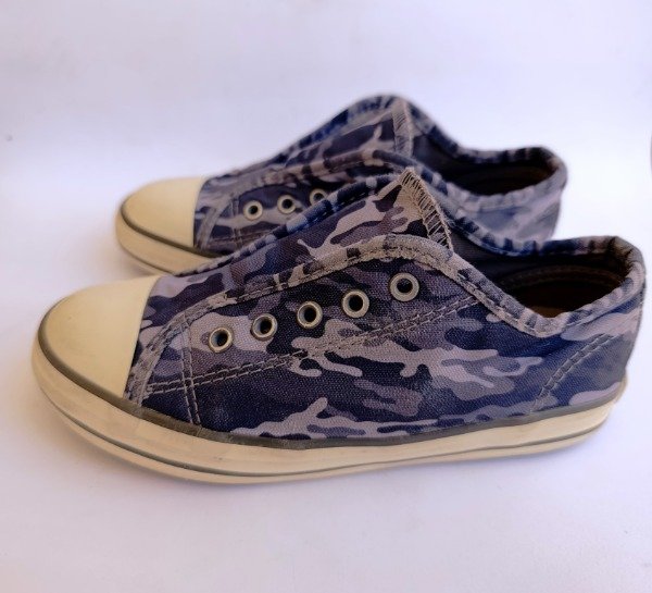 Zapatillas de lona estampado camuflado. Con calce elástico sin cordones. Plantilla interna 19 cm. USADO, buen estado