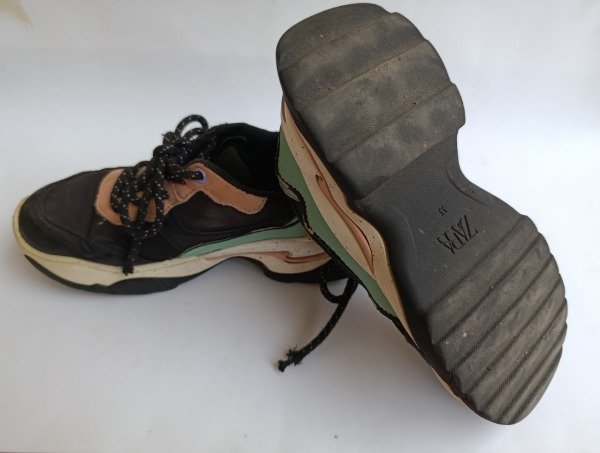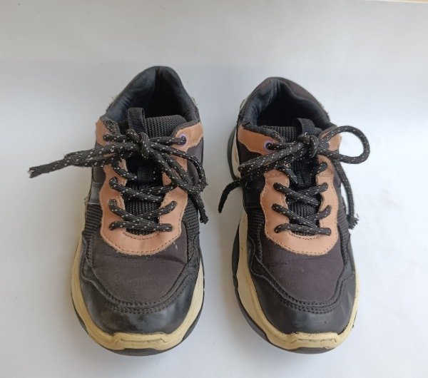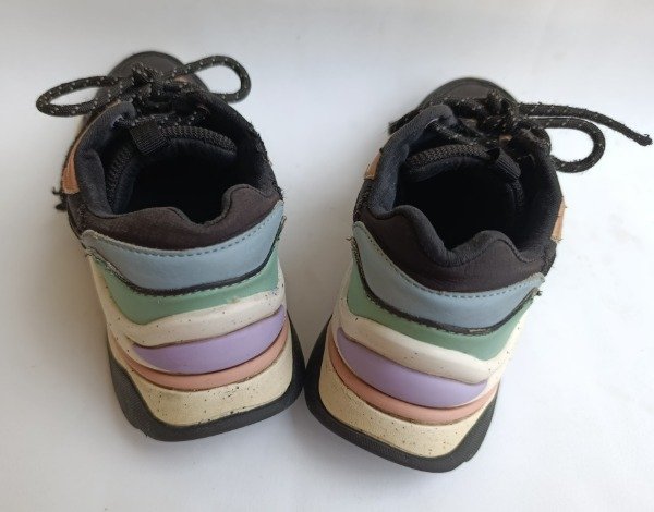 Zapatillas de lona y gamuza en color negro con combinaciones en colores pastel. Plantilla interna 21 cm. USADO, buen estado