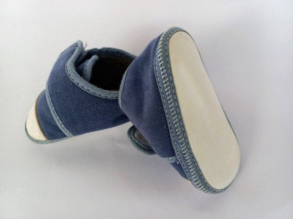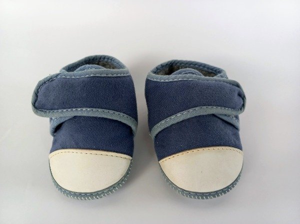 Zapatillas de fieltro con peluche por dentro color azul. Poseen abrojo para ajustar el calce. Plantilla interna 9,5 cm. COMO NUEVO