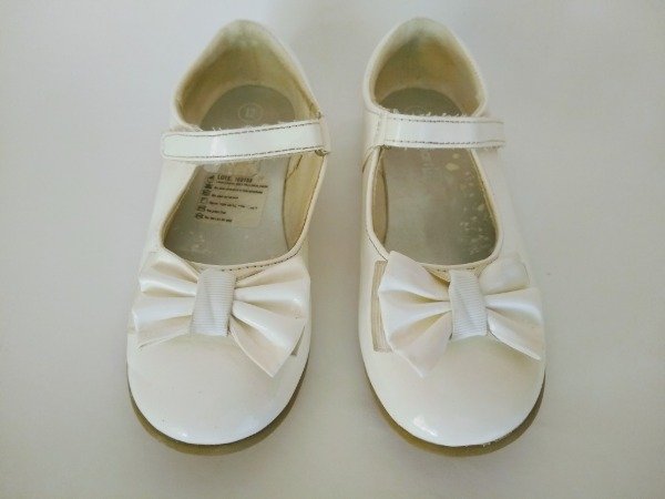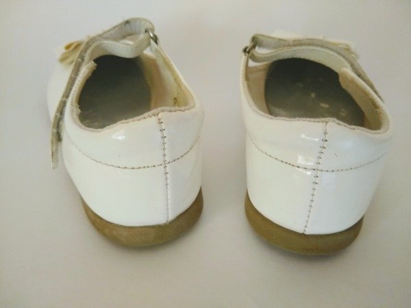 Zapatos color blanco charolado, con moño en el frente. Se prenden con precilla de abrojo. Plantilla interna 18,5 cm. USADO, excelente estado