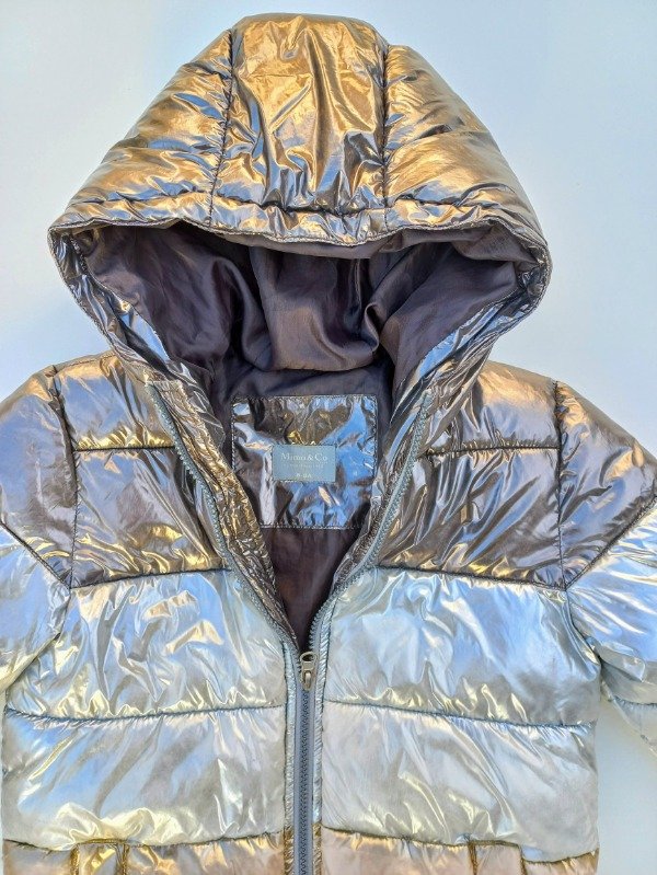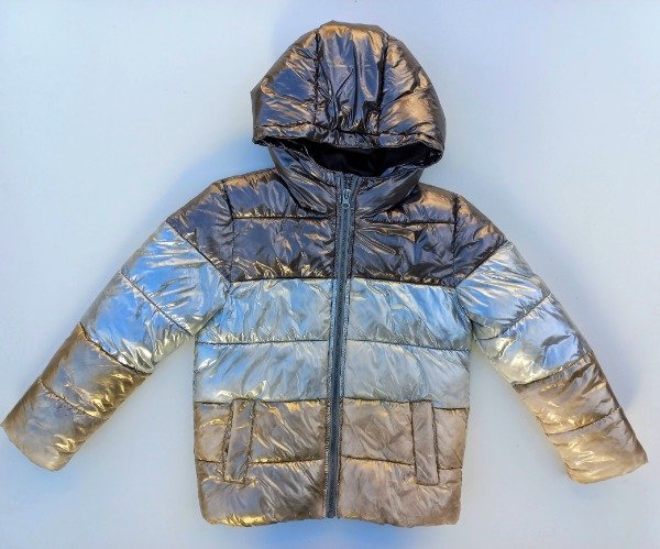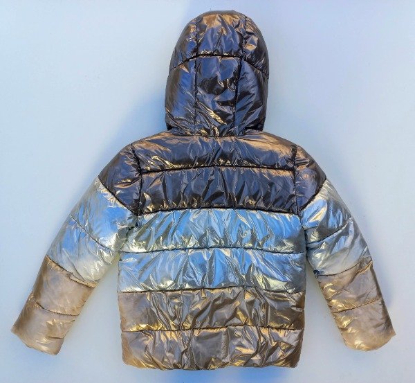 Campera de abrigo con combinación de tres tonos brillantes. Medidas: ancho de hombro 34 cm, largo de manga 48 cm, largo total 52 cm. USADO