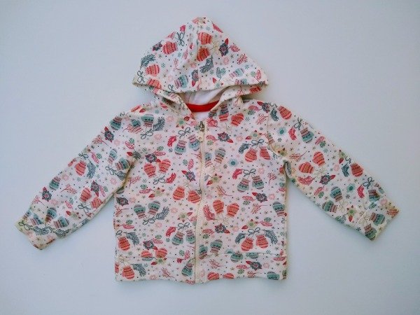 Campera de algodón con friza estampada. Medidas: ancho de hombro 26 cm, largo de manga 32 cm, largo total 35 cm. USADO