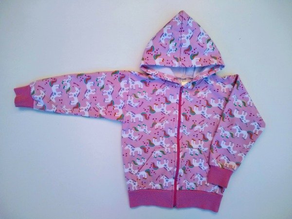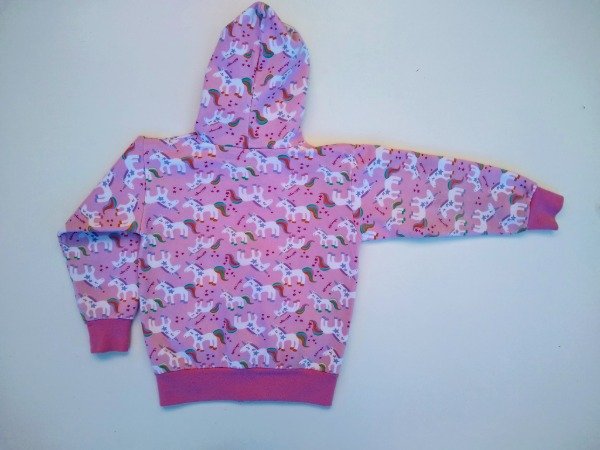 Campera de algodón con friza estampado unicornios. Tiene capucha y bolsillos canguro. Medidas: ancho de hombro 37 cm, largo de manga 38 cm, largo total 47 cm. USADO