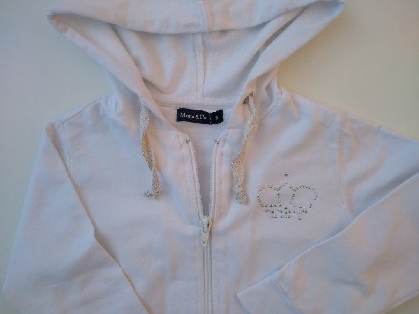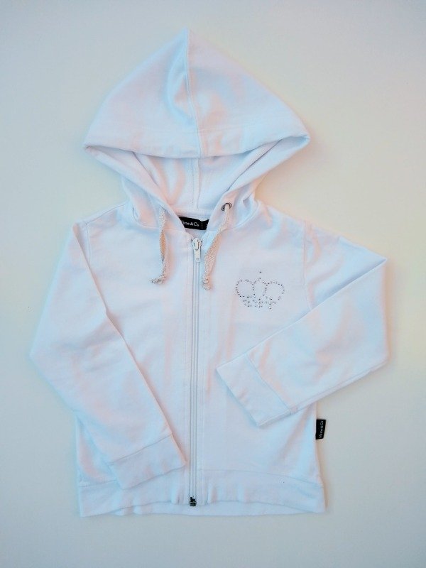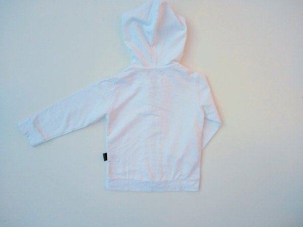 Campera de algodón sin friza color blanco con capucha. Medidas: ancho de hombro 29 cm, largo de manga 35 cm, largo total 36 cm. COMO NUEVO