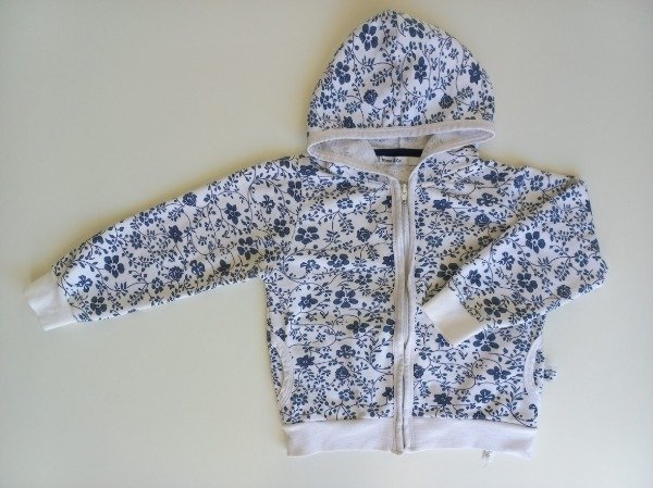 Campera de algodón rústico estampado con ribetes en color blanco. Medidas: ancho de hombro 29 cm, largo de manga 39,5 cm, largo total 40 cm. USADO