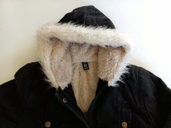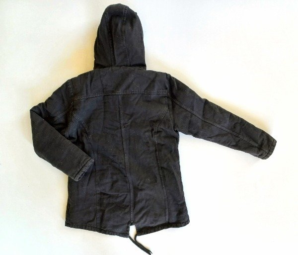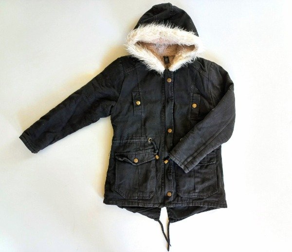 Campera de gabardina color negro tipo parka forrada en corderito. Medidas: ancho de hombro 36 cm, largo de manga 47 cm, largo total 58 cm. COMO NUEVO