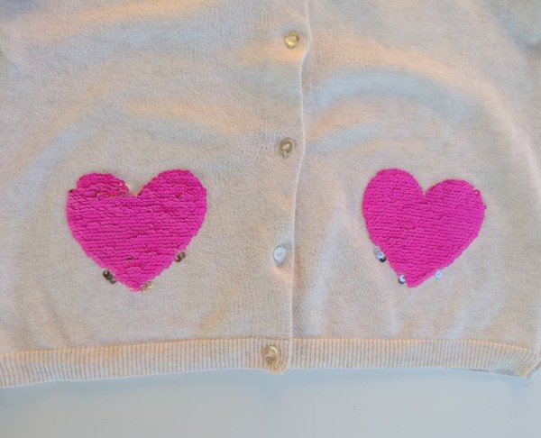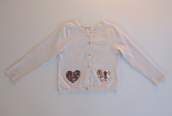 Campera de hilo en color natural con apliques de corazones en lentejuelas bifaz. Tall 6-8 años. Medidas: ancho de hombro 31,5 cm, largo de manga 48 cm, largo total 45 cm. USADO, buen estado