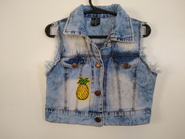 Chaleco de jean celeste localizado con aplique en el frente y sisa desflecada. Medidas: ancho de hombro 24 cm, largo 27,5 cm. USADO, buen estado