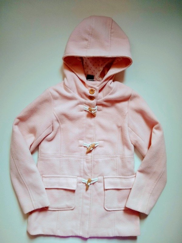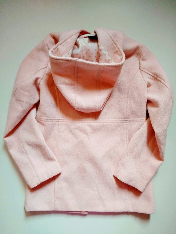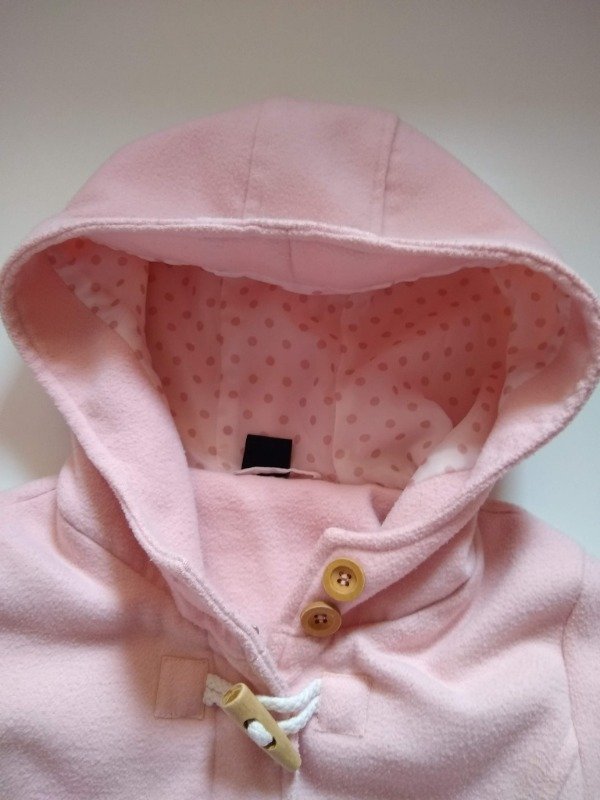 Saco montgomery de paño en color rosado forrado en seda a lunares. Tiene capucha. Se prende con cierre, alamares y botones de madera. Medidas: ancho de hombro 30 cm, largo de manga 47,5 cm, largo total 58 cm. USADO, buen estado