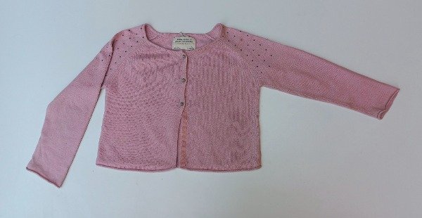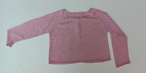 Saquito de hilo en color coral. Tiene tachas en los hombros. Talle 4-5 años. Medidas: ancho de sisa a sisa 35 cm, largo de manga 31 cm, largo total 33 cm. USADO
