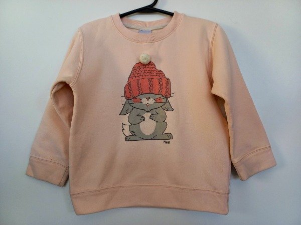 Buzo de algodón con friza color durazno con estampa y aplique al frente. Medidas: ancho de hombro 29 cm, largo de manga 32,5 cm, largo total 41 cm. USADO, excelente estado