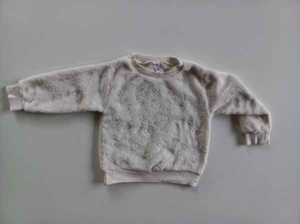 Buzo de peluche color blanco. Medidas: ancho de hombro 28 cm, largo de manga 31,5 cm, largo total 37 cm. USADO, buen estado