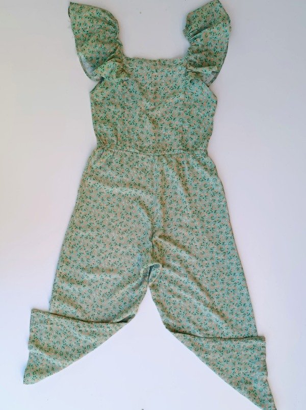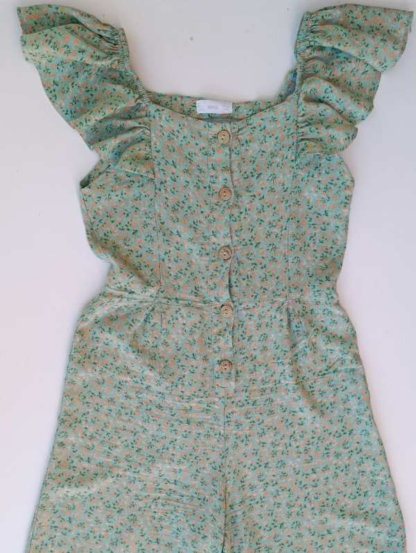 Enterito sin mangas de poplin estampado. Tiene botones en el frente y elástico en la parte posterior de la cintura. Medidas: ancho de sisa a sisa 37 cm, largo hasta la cintura 35 cm, largo total 118 cm. USADO, buen estado