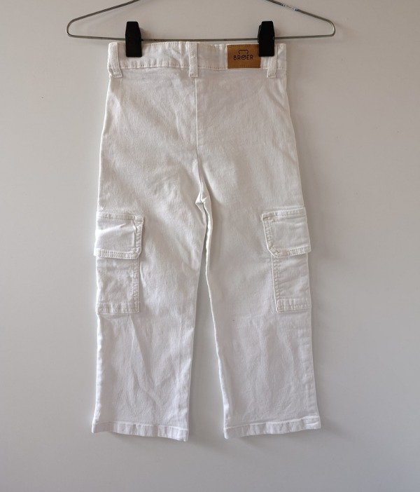 Pantalón de gabardina elastizada en color blanco, tipo cargo. Tiene elástico y botón en la cintura para regular el calce. Medidas: cintura 26,5 cm, largo 67 cm. COMO NUEVO