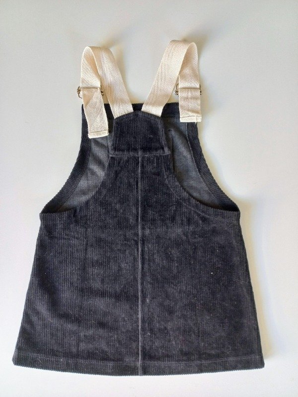 Jardinera de corderoy en color negro con tiras en tono natural. Medidas: ancho cintura 29 cm, largo desde extremo superior pechera 41 cm. COMO NUEVO