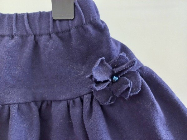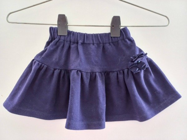 Pollera de algodón rústico color azul. Tiene elástico en la cintura y aplique de flor. Medidas: cintura 20 cm, largo 23 cm. COMO NUEVO
