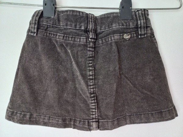 Pollera de corderoy en color negro. Tiene elástico y botón en la cintura para regular el calce. Medidas: cintura 25 cm, largo 23 cm. USADO, buen estado