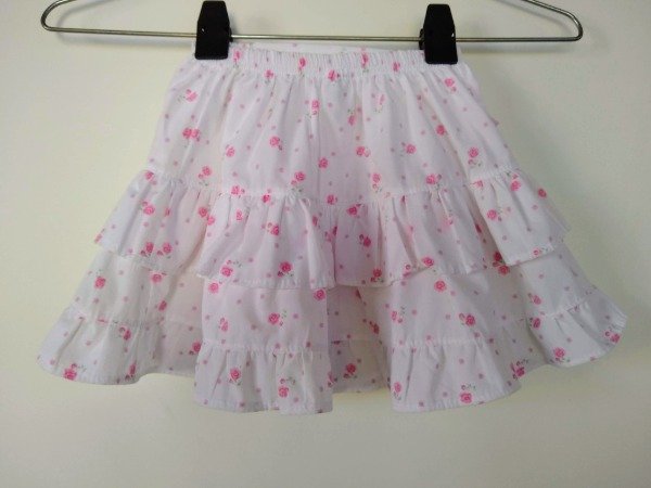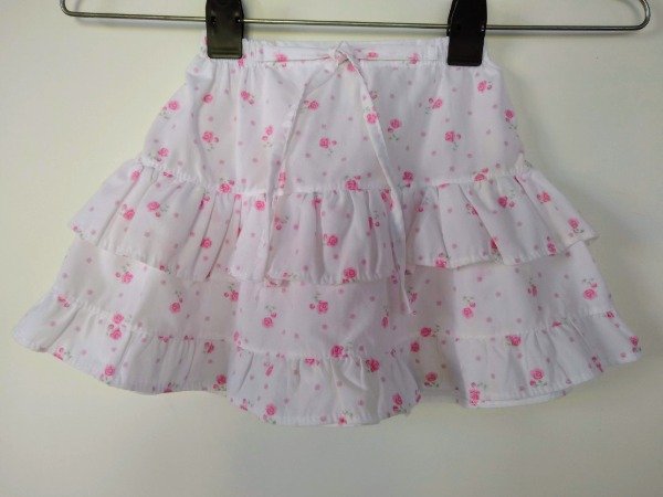 Pollera de poplin estampado con volados. Tiene elástico en la parte posterior de la cintura y en el frente un lazo. Medidas: cintura 18 cm , largo 24,5 cm. USADO, buen estado