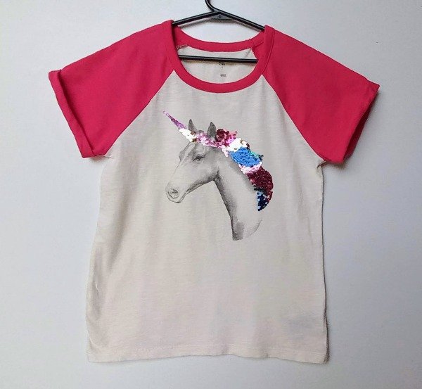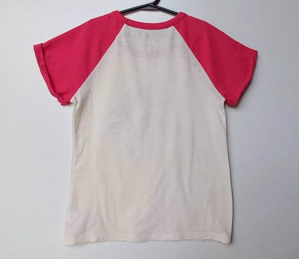 Remera manga corta de algodón en color blanco con mangas rosa. Tiene estampa con lentejuelas al frente. Talle L de la marca. Medidas: ancho de sisa a sisa 38 cm, largo 53 cm. COMO NUEVO